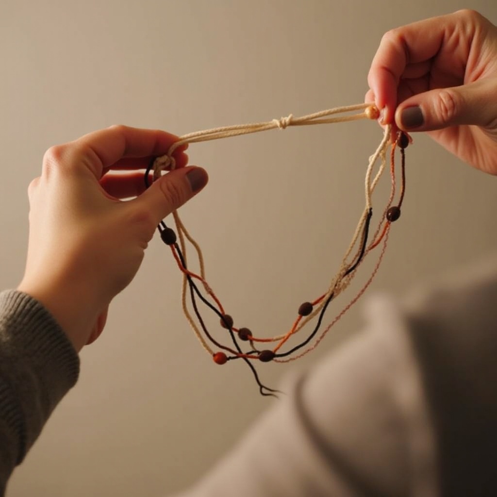 Obwohl Sie verschiedene Arten verwenden können, sorgt die Auswahl von haltbarem und flexiblem Faden wie Nylon oder gewachster Baumwolle für Langlebigkeit und unterstützt kreative Designs.
